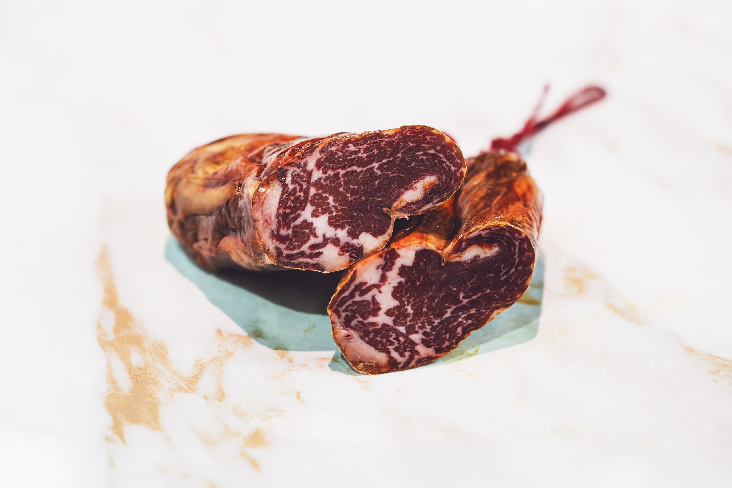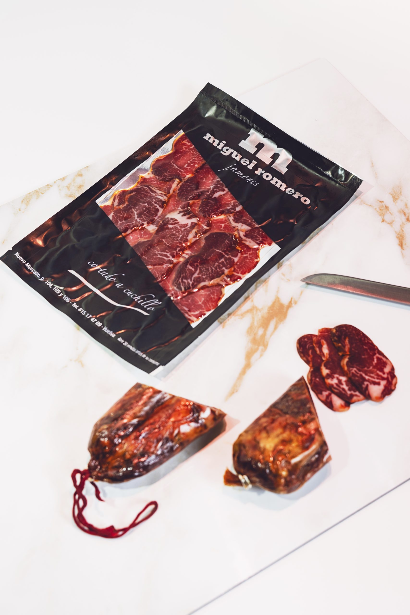 El Lomo de Presa de Bellota se presenta en pieza entera, permitiendo apreciar su veteado característico y su color rojo intenso. Al corte, ofrece lonchas jugosas y llenas de sabor, ideales para degustar en finas rodajas.
