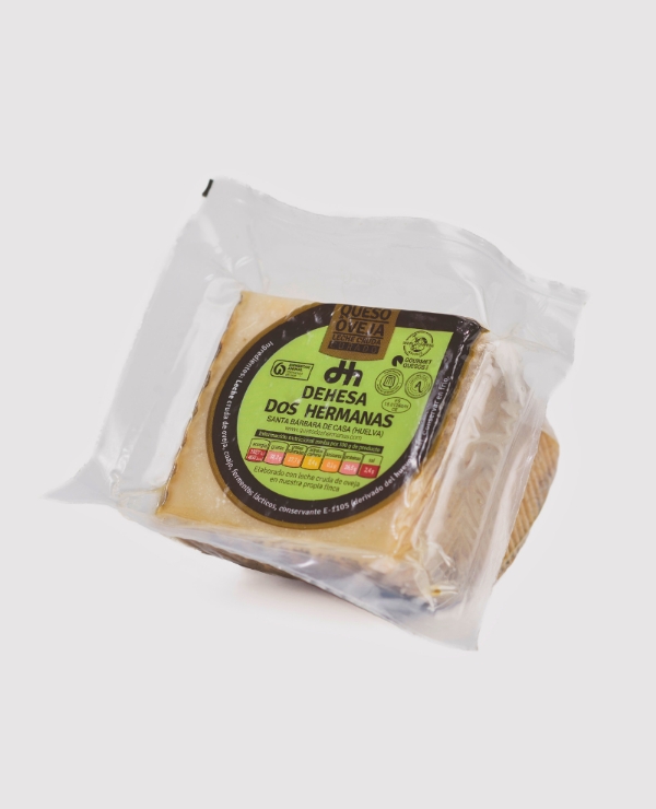 Queso de oveja curado elaborado artesanalmente en la Sierra de Huelva, con leche cruda de ovejas de raza Lacaune criadas en la finca Dehesa Dos Hermanas, en Santa Bárbara de Casa.