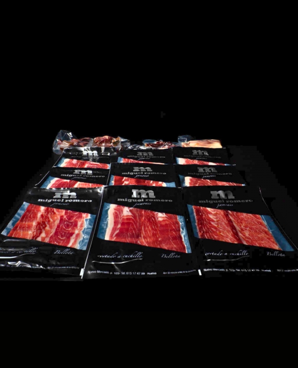 Este jamón pertenece a la categoría de bellota ibérico, con precinto rojo, que identifica a los jamones procedentes de cerdos de raza ibérica al 50% o 75%, alimentados con bellotas y pastos en la época de montanera. Las piezas han sido seleccionadas una a una por Miguel Romero en bodegas de confianza, con una curación natural de 24 a 36 meses, desarrollando así su aroma, untuosidad y sabor profundo.