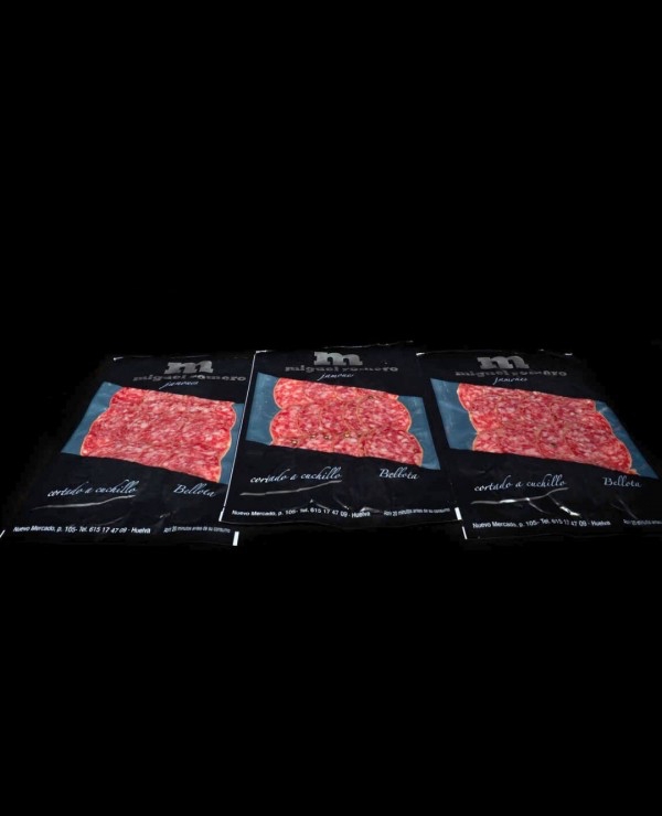 Salchichón ibérico de bellota, cortado a cuchillo y envasado al vacío en sobres de 125 g. Elaborado con carnes nobles de magro y grasa de cerdos ibéricos de bellota, con un toque de pimienta negra en grano. Con más de 4 meses de curación en las bodegas de la Sierra de Huelva, este salchichón destaca por su picado fino y su aroma suave y dulce.